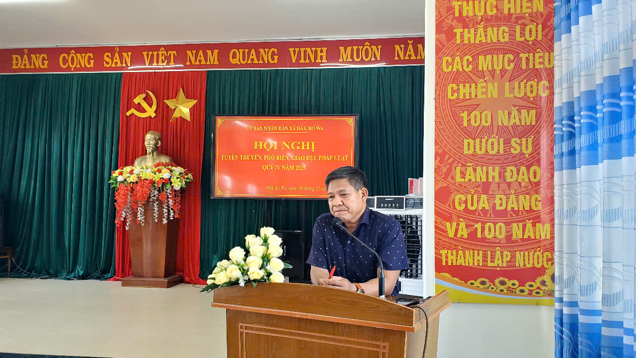 Ngày 29 tháng 12 năm 2025, UBND xã Đăk Rơ Wa tổ chức Hội nghị tuyên truyền, phố biến, giáo dục pháp luật quý III, năm 2025. Tham dự Hội nghị có đồng chí A Hậu , UV BTV Đảng ủy – Chủ tịch UBMT Tổ quốc Việt Nam xã; Đồng chí Phạm Văn Dũng, Đảng ủy viên – Phó chủ tịch UBND xã chủ trì Hội nghị; cùng các đồng chí Trưởng, phó Phòng ban chuyên môn, cán bộ, công chức thuộc UBND xã và cùng đông đảo các ông bà thôn trưởng các thôn trên địa bàn xã tham dự.