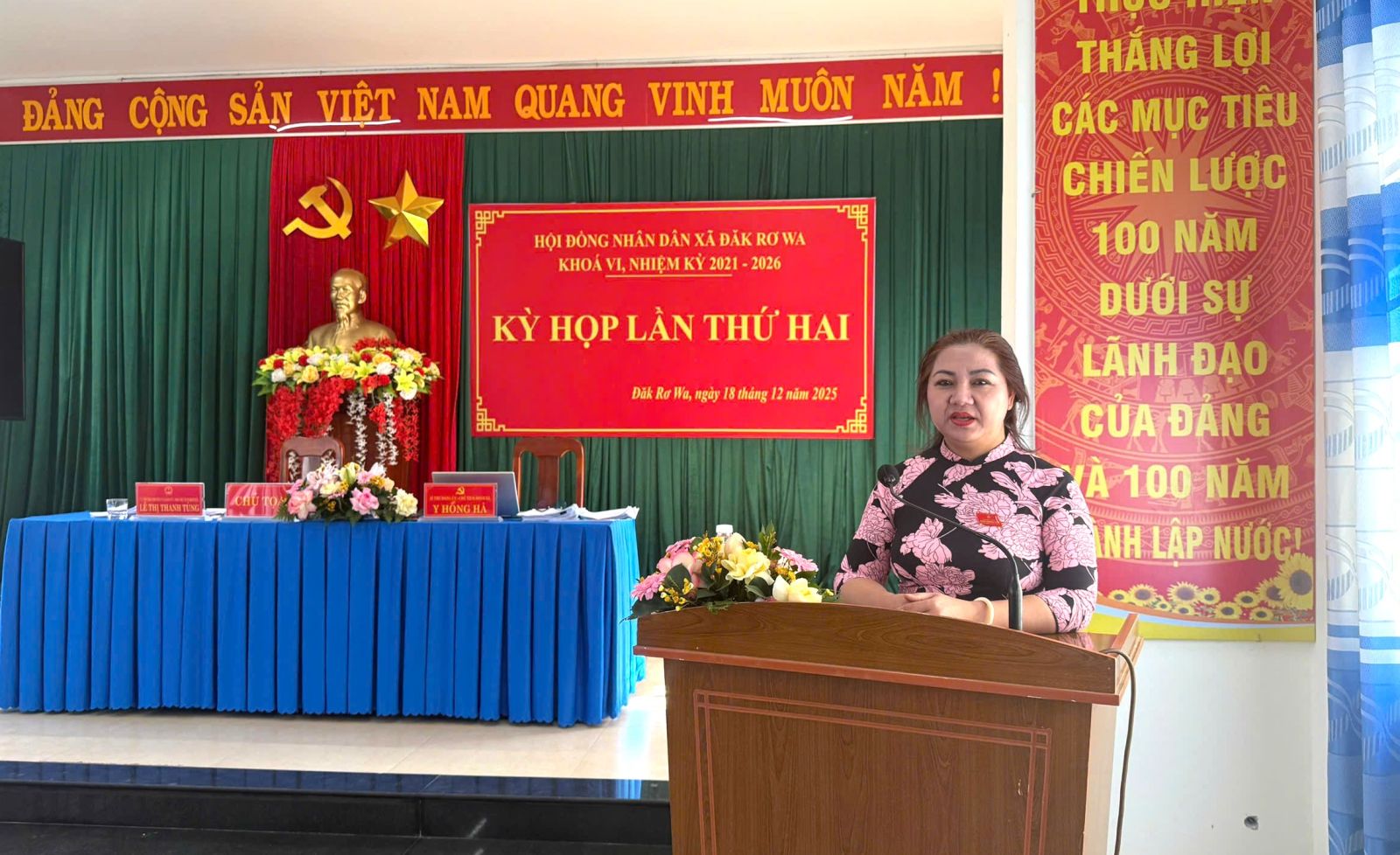 Đồng chí: Y Hồng Hà, Bí thư Đảng ủy, Chủ tịch HĐND xã và đồng chí Lê Thị Thanh Tùng, Phó Chủ tịch HĐND xã đồng chủ tọa kỳ họp. Đại diện lãnh đạo UBND xã có đồng chí Hà Đường, phó Bí thư Đảng ủy, Chủ tịch UBND xã; Đồng chí A Hậu - Ủy viên BTV Đảng ủy, Chủ tịch UBMT TQVN xã; Tham dự kỳ họp còn có các đồng chí trong BTV Đảng ủy, lãnh đạo HĐND, UBND xã, Ủy ban Mặt trận Tổ quốc xã; trưởng các ban, ngành, đoàn thể cùng 82 đại biểu HĐND xã, thôn trưởng các thôn.